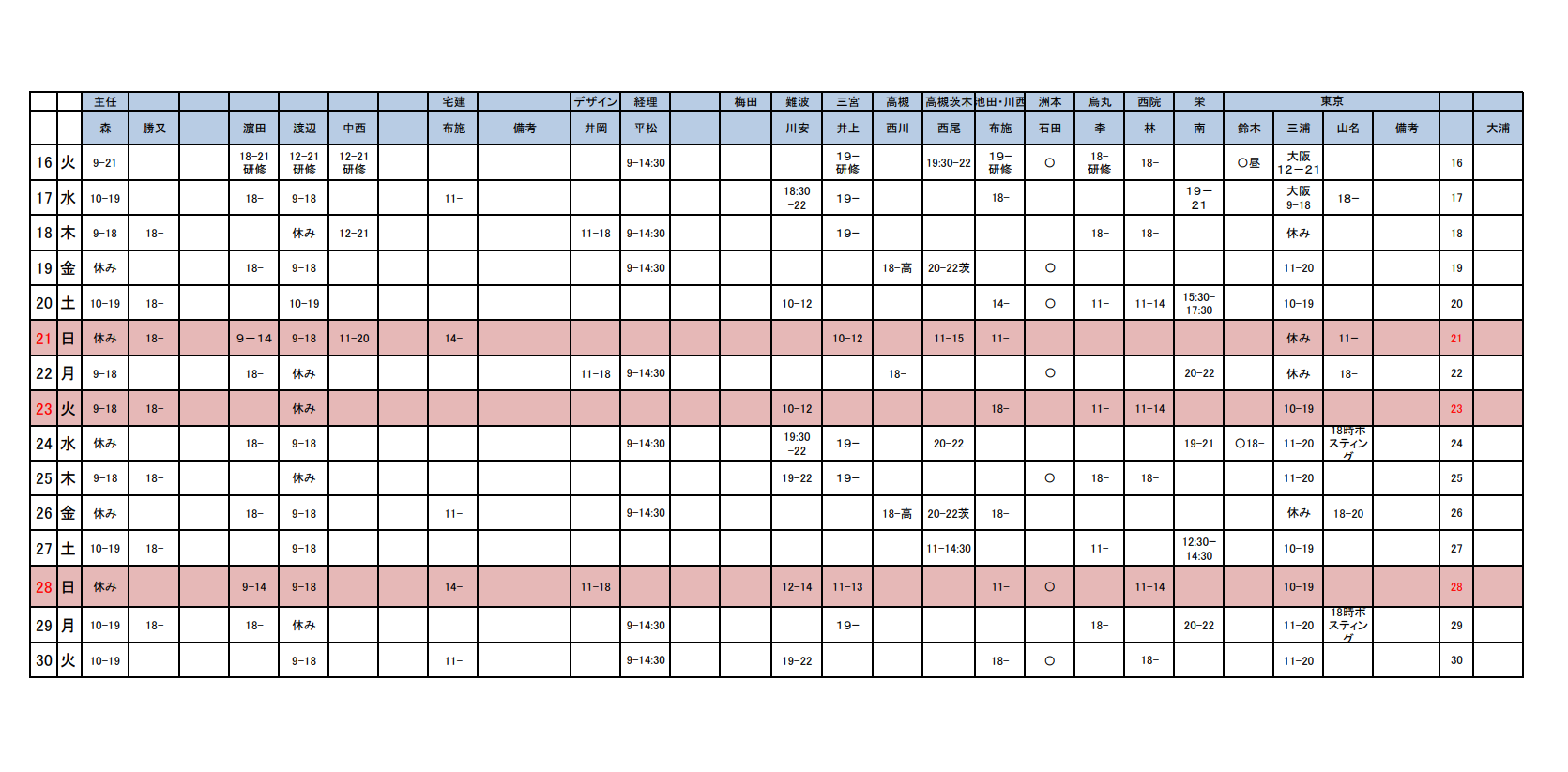 11月後半シフト 23日まで